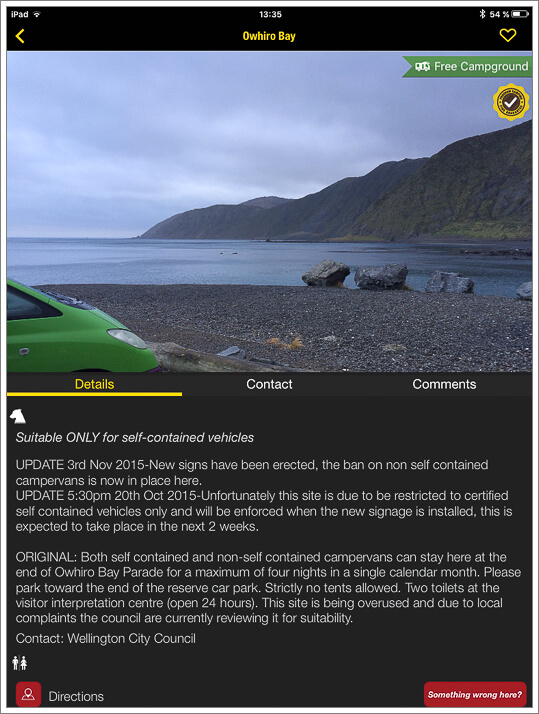 - En algunos casos, las zonas de acampada gratis estipuladas por los ayuntamientos («designed areas») no aparecen. Cuando buscábamos zona para dormir gratis de forma legal, muchas de las zonas que aparecen en su competidor CamperMate, no se mostraban en CampingNZ…y luego cuando íbamos efectivamente existían.
