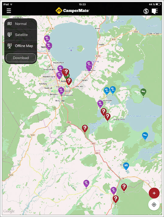 Centrándonos en Nueva Zelanda, las dos aplicaciones más conocidas para móviles y tablets son CampingNZ y CamperMate. Antes de ir al pais kiwi habíamos leído opiniones en blogs que valoraban ambas aplicaciones como superponibles en cuanto a calidad y utilidad, por lo que descargamos y llevamos ambas, al fin y al cabo son gratis. Una vez sobre el terreno solo acabamos utilizando CamperMate ya que es más útil y fiable que CampingNZ.